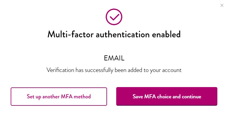 Step 5: You have now enabled Email authentication as your MFA. You have the choice to set up another MFA method or save MFA choice and continue.