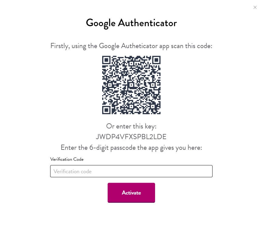 Step 3: Follow the on-screen instructions - Scan the QR code shown on the screen using the Google authenticator app or enter the 16-character key shown on the screen into the Google authenticator app. Enter the 6-digit code generated by the Google authenticator app into the verification code box on the website. Click the activate button.