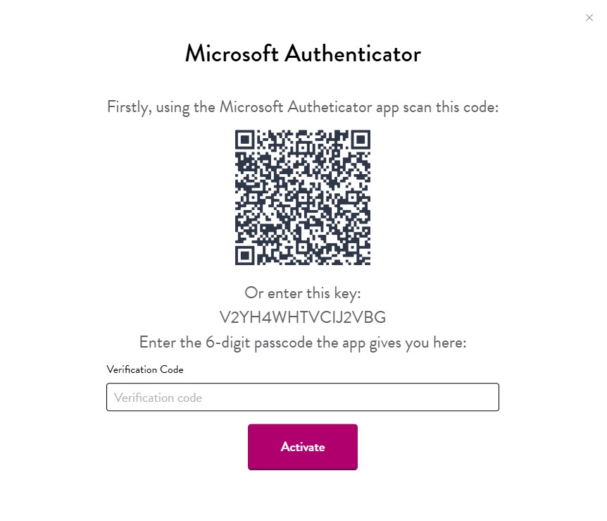 Step 3: Follow the on-screen instructions - Scan the QR code shown on the screen using the Microsoft authenticator app or enter the 16-character key shown on the screen into the Microsoft authenticator app. Enter the 6-digit code generated by the Microsoft authenticator app into the verification code box on the website. Click the activate button.