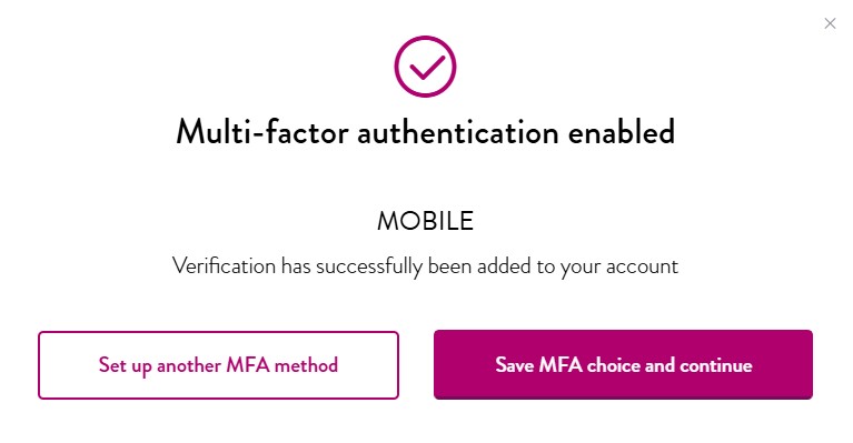 Step 5: You have now enabled Mobile authentication as your MFA. You have the choice to set up another MFA method or save MFA choice and continue.